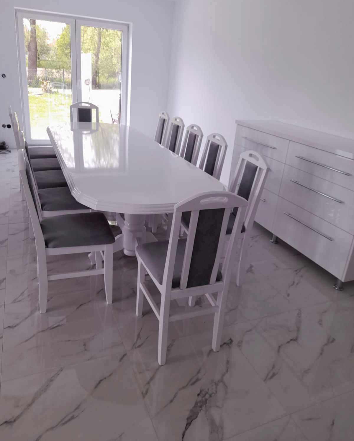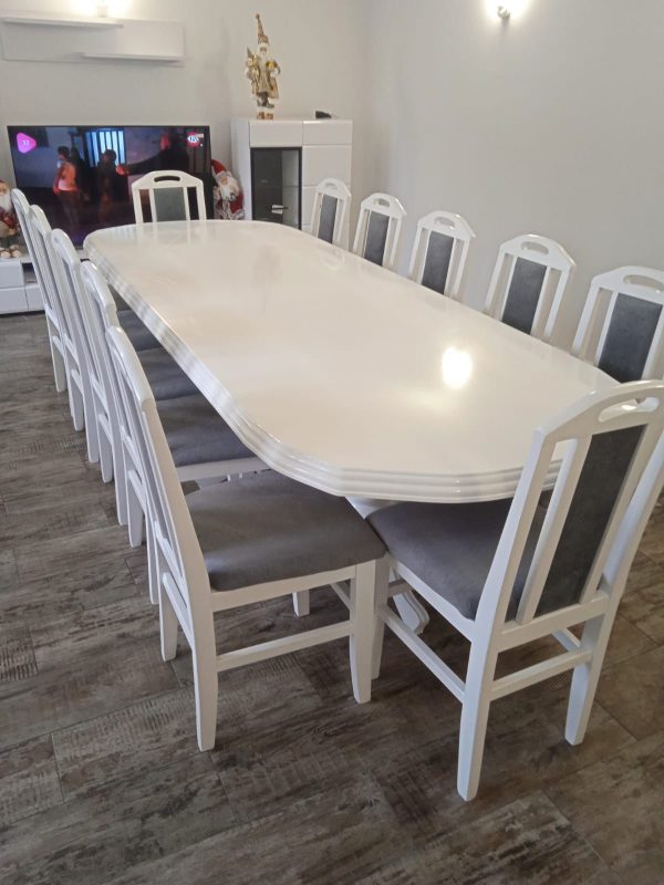 Setul de masa din lemn masiv care vine împreună 12 scaune are aer un modern, unic și luxos care va adăuga o notă de eleganță oricărei case sau birou având posibilitatea de a organiza de dumneavoastră la petreceri sau întâlniri la care toată lumea va rămâne împresionată de noul set al dumneavoastră. Masa a fost proiectată pentru a fi confortabilă atât pentru evenimente mari, cât și pentru evenimente mici, ceea ce o face ideală pentru utilizarea în toate locuințele fiind perfecta pentru orice spațiu în care veți decide poziționarea setului setului dumneavoastră.